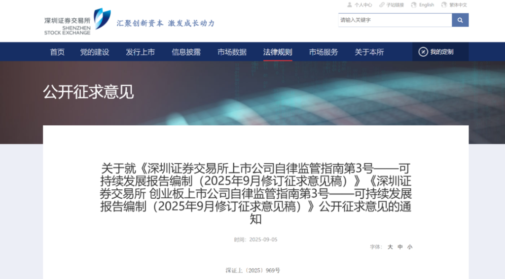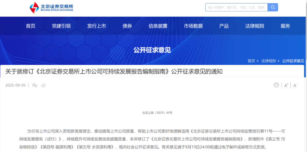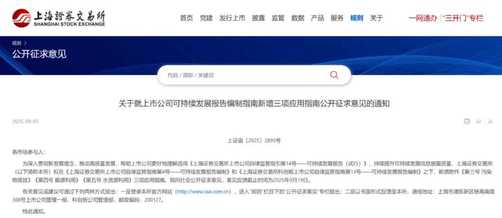 9月5日晚,上交所、深交所、北交所同步发布通知,就修订“可持续发展报告编制指南”(以下简称《指南》)公开向社会征求意见,意见反馈截止时间为2025年9月19日。