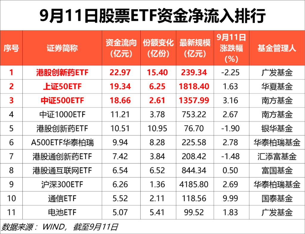 9月11日,A股市场主流指数全线收涨,创业板指大涨5.15%,资金借道股票ETF大举加仓的赛道开始浮出水面。