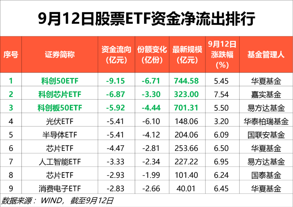 除上述宽基ETF外,资金流出居前的细分行业主题ETF还包括光伏ETF、半导体ETF、芯片ETF、消费电子ETF、人工智能ETF。