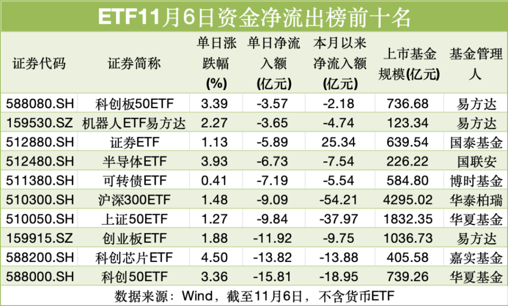 多只跟踪科创50指数、创业板指数、科创芯片指数、上证50指数、沪深300指数的ETF位居资金净流出榜前列。