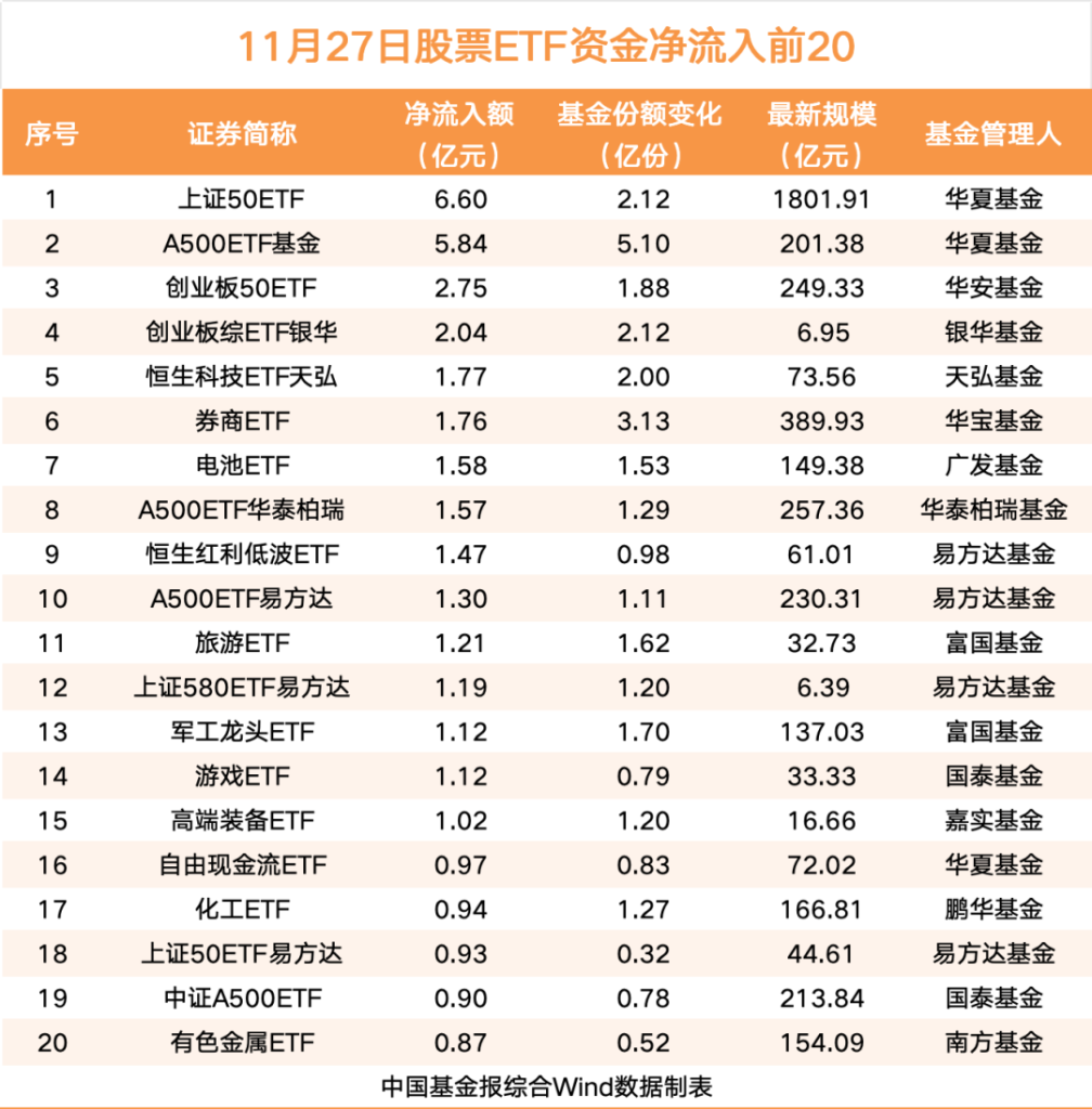 具体来看,11月27日共有15只ETF资金净流入超1亿元。其中,华夏基金的上证50ETF、A500ETF基金分别以6.6亿元、5.84亿元的资金净流入排在第一位、第二位,华安基金的创业板50ETF以2.75亿元的资金净流入排在第三位。
