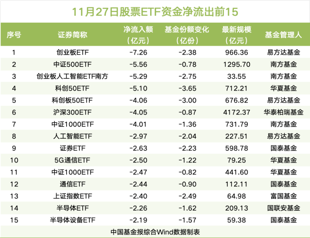 11月27日,A股三大指数涨跌不一。股票ETF市场上,资金延续了净流出态势,当日净流出超55亿元。