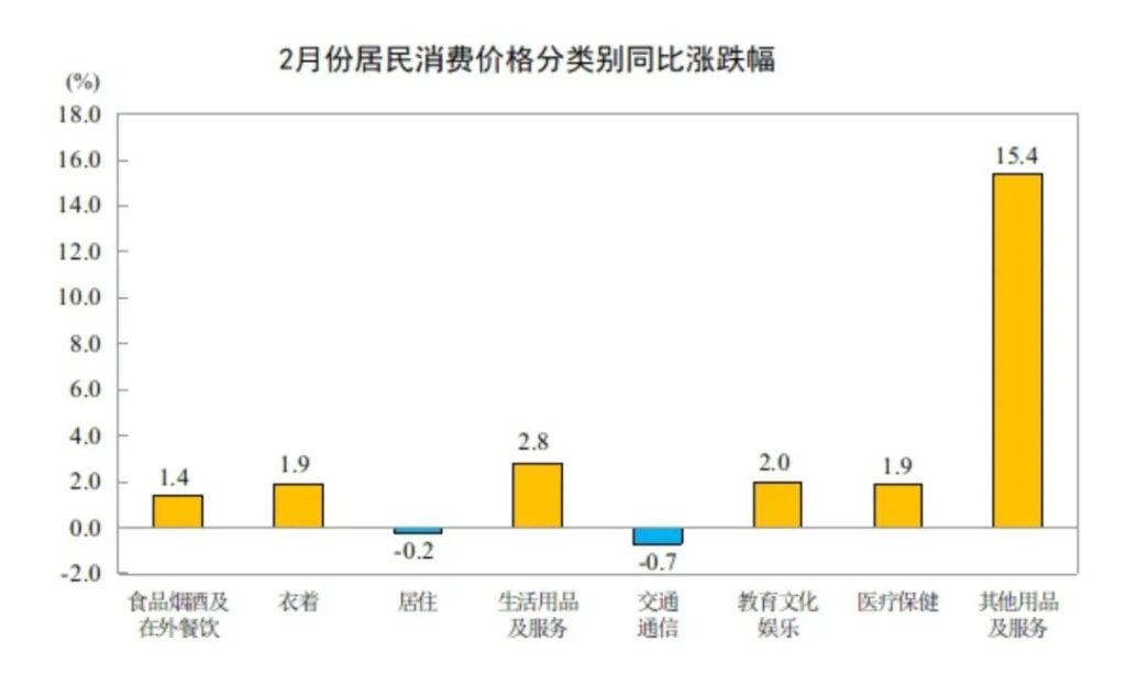 从同比看,春节错月叠加消费需求恢复影响,全国CPI涨幅由上月的0.2%扩大至1.3%,为近三年来最高。其中,服务价格上涨1.6%,涨幅比上月扩大1.5个百分点,影响CPI同比上涨约0.75个百分点。服务中,飞机票、交通工具租赁、旅行社收费和宾馆住宿价格由上月下降转为分别上涨29.1%、19.8%、12.5%和5.4%;宠物服务、车辆修理与保养、家政服务、外卖餐饮价格分别上涨13.0%、12.0%、6.3%和5.6%;电影及演出票价格下降1.1%;房屋租赁进入淡季,房租价格下降0.6%。工业消费品价格上涨1.1%,涨幅比上月扩大0.2个百分点。其中,黄金饰品价格上涨76.6%,涨幅小幅回落;家用器具、家庭日用杂品和服装价格分别上涨5.3%、2.6%和2.0%;汽油价格下降9.8%;小汽车价格下降1.2%。食品价格由上月下降0.7%转为上涨1.7%,影响CPI同比上涨约0.30个百分点。食品中,鲜菜、牛肉、羊肉和鲜果价格涨幅在5.9%—10.9%之间,涨幅比上月均有所扩大,合计影响CPI同比上涨约0.41个百分点;猪肉和鸡蛋价格分别下降8.6%和3.0%,降幅比上月均有收窄,合计影响CPI同比下降约0.18个百分点。