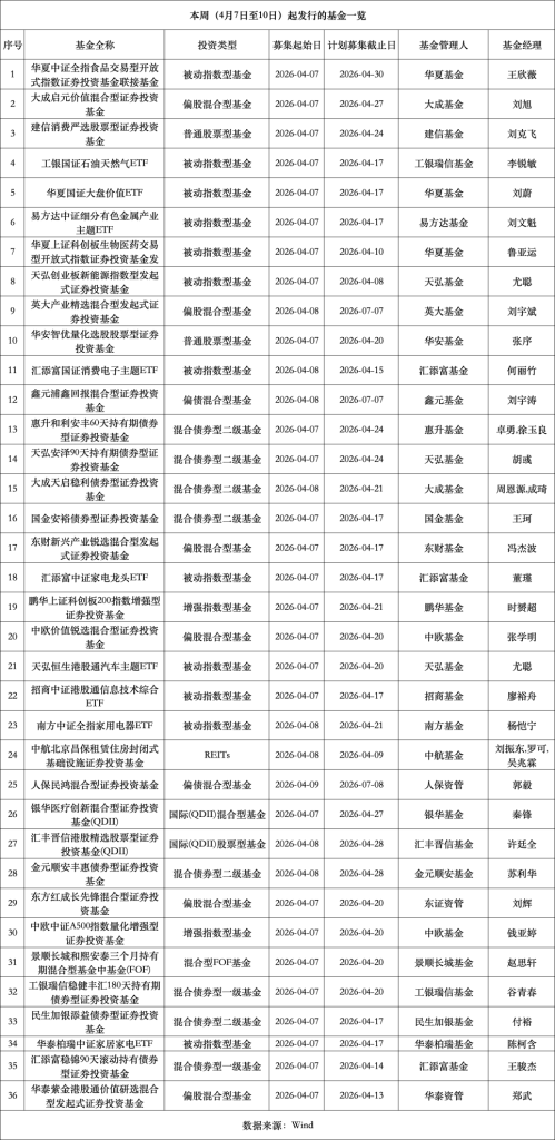 本周(4月7日—4月10日),全市场共有36只新基金面向投资者公开发行。